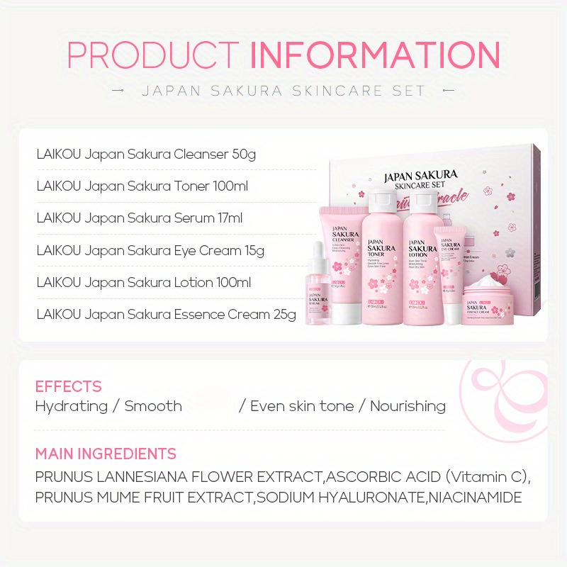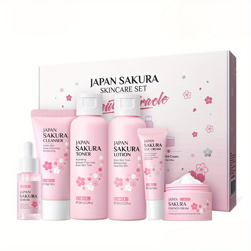 6PCS JAPAN SAKURA ™ Skincare Gift Set, Cleanser, Toner, Lotion, Essence, Eye Cream, Serum - For All Skin Types, For Women and Girls