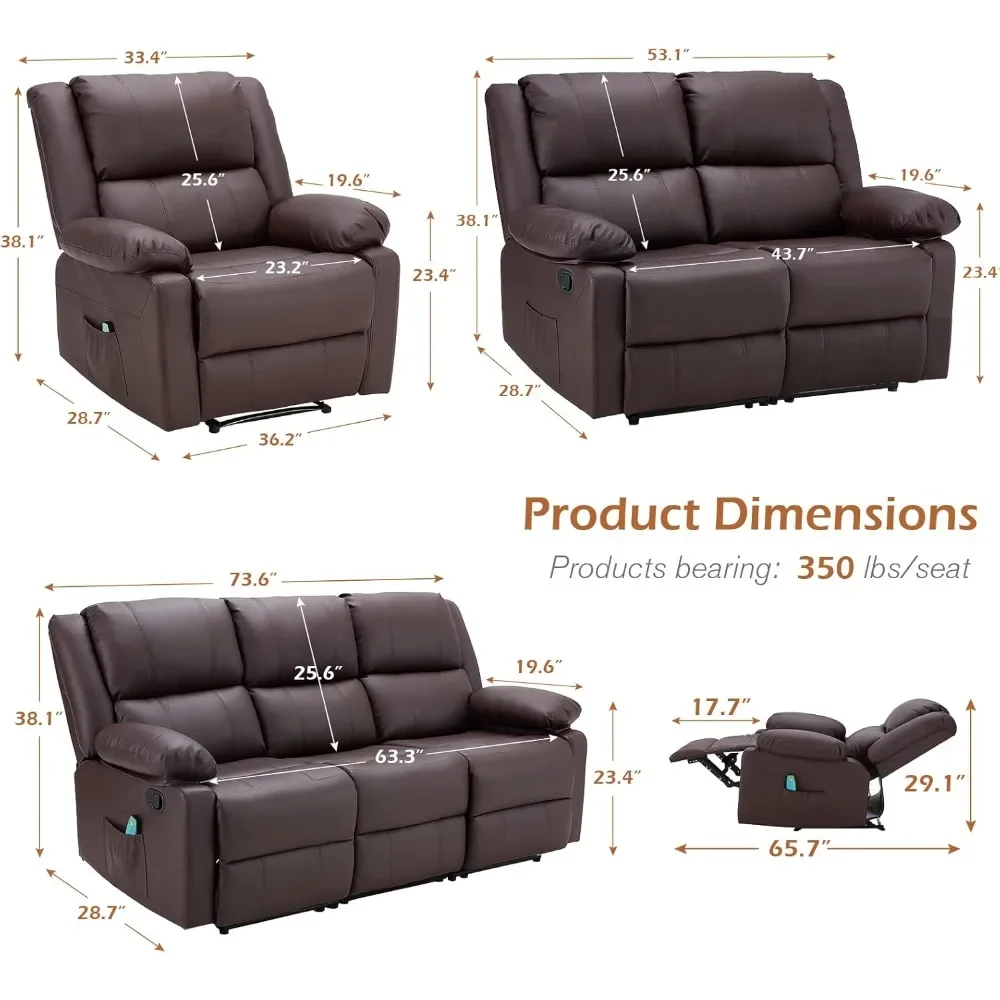 COMFYCOVE™ 3 Pieces Recliner Sofa Set, Overstuffed Recliner Sofa with Massage AND Heat Function, Modern Manual Control Faux Leather Couch Set