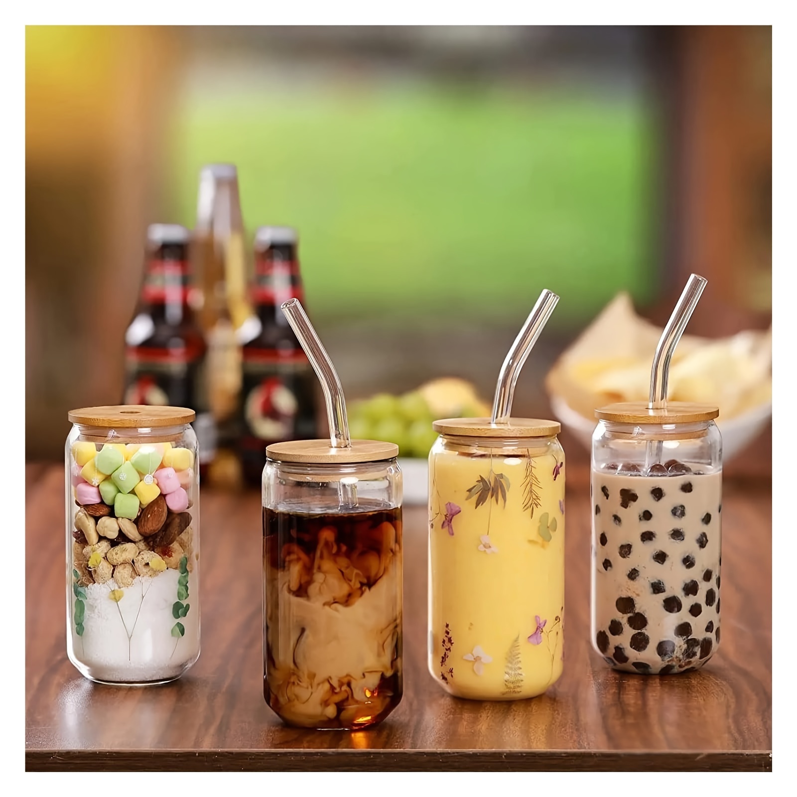 Sip in style with our eco-friendly Can Shaped Drinking Glasses with Bamboo Lids and Glass Straw. Perfect for capturing the taste and aroma of your favorite beverages, our sleek glass cups are great for beer, coffee, and cocktails alike. Embrace sustainability while savoring every sip.