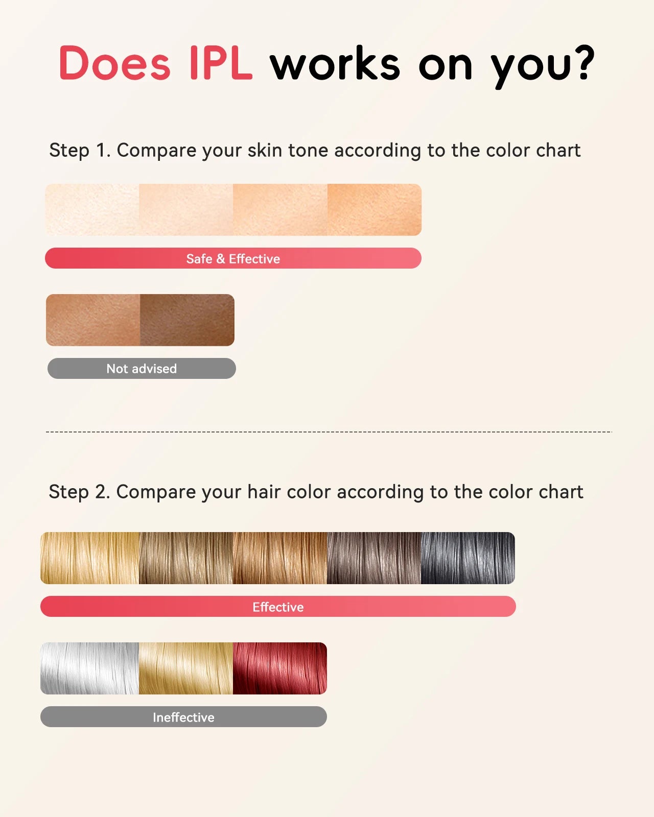● IPL epilator is suitable for white to light brown skin and black to light brown body hair. However, this product should not be used on: Tanned, tattooed and dark-spotted skin, white, gray or red body hair (see skin tone chart)