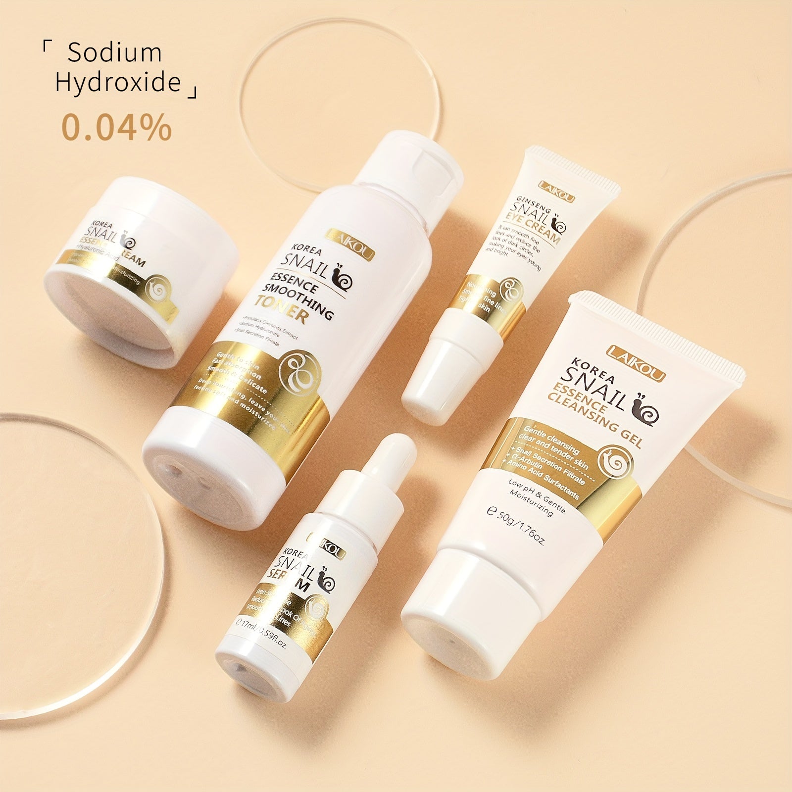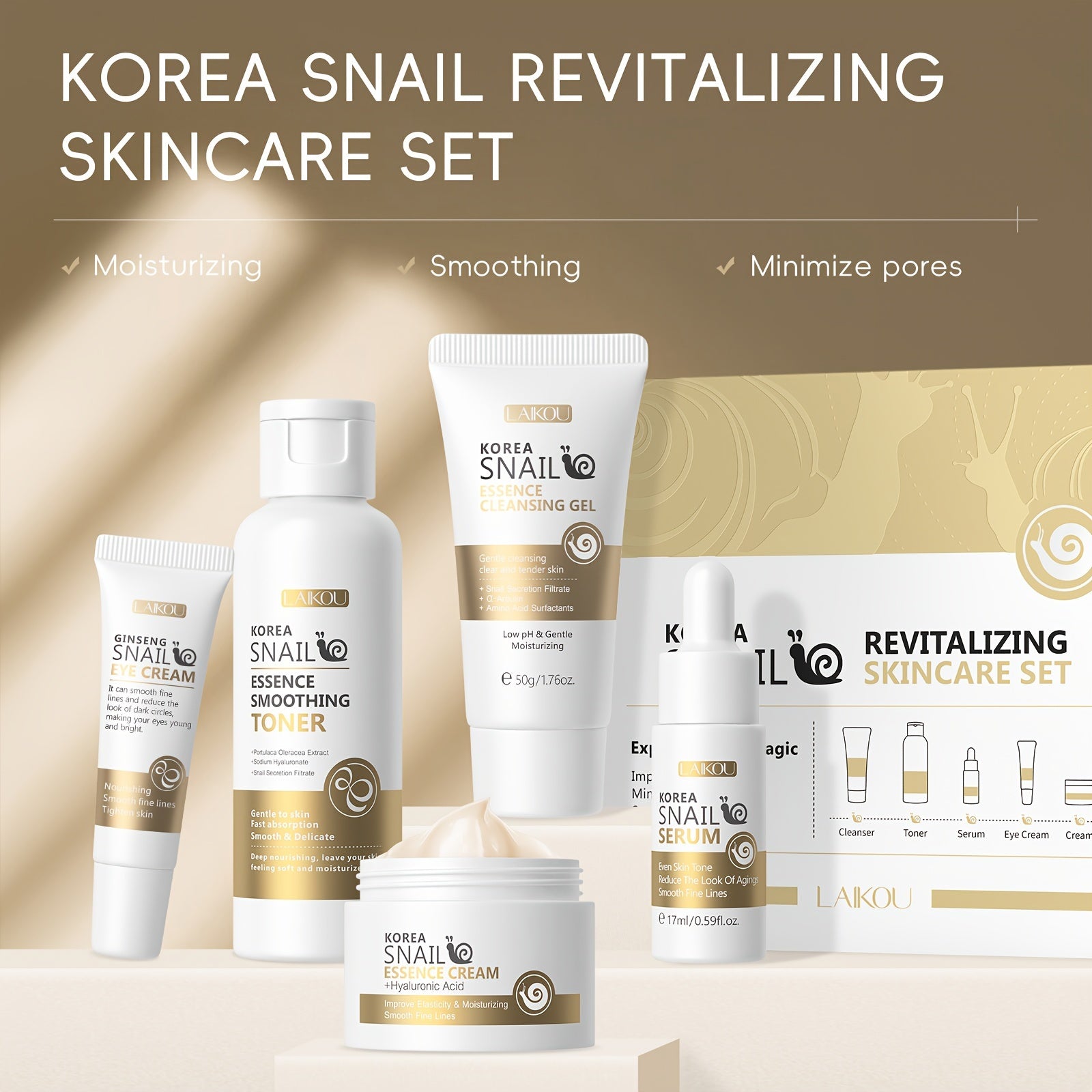 KOREAN™ skincare LAIKOU Snail Mucin 5-Step Skincare Set - Hypoallergenic Revitalizing Kit, Unisex, for All Skin Types, Includes Cleansing Gel