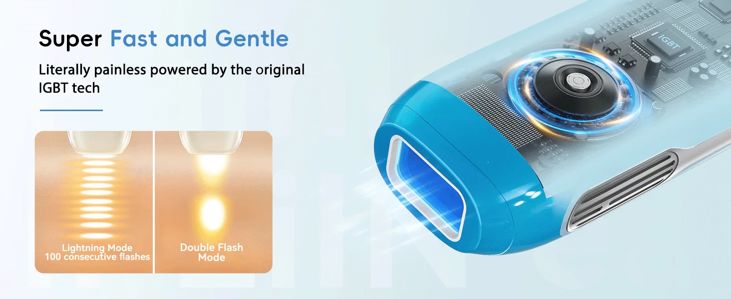 【80% Faster Hair Removal】 The laser hair removal can deliver 80% faster effective results than other normal one which because of the updated 5.2cm² contact windows>3 cm²(other normals). Meanwhile, the device upgrade a new function. ‘Lightning icon’.This setting significantly increases the flashing speed, emitting approximately 100 pulses of light in rapid succession with each activation.This technique endow you can go out quickly and beautifully.