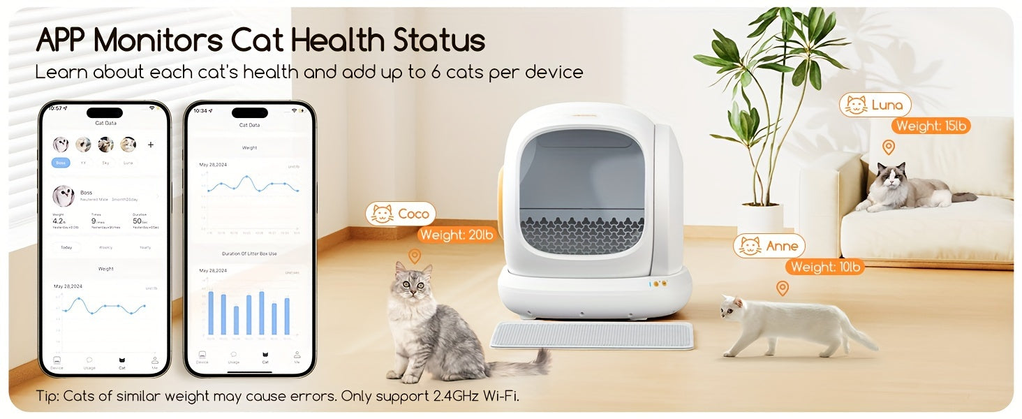 APP Control & Health Monitoring: The Self Cleaning Cat Litter Box Is Connected With 2.4GHz Wi-Fi. You Can Keep Your Cat Litter Box Clean At Anytime And From Anywhere With AIRPET App. With Data Pushed Periodically, You Are Able To Monitor Your Cat's Weight And Activity In Real Time. Please Note That The APP Supports Up To 6 Cats, And Cats Of Similar Weight May Cause Errors