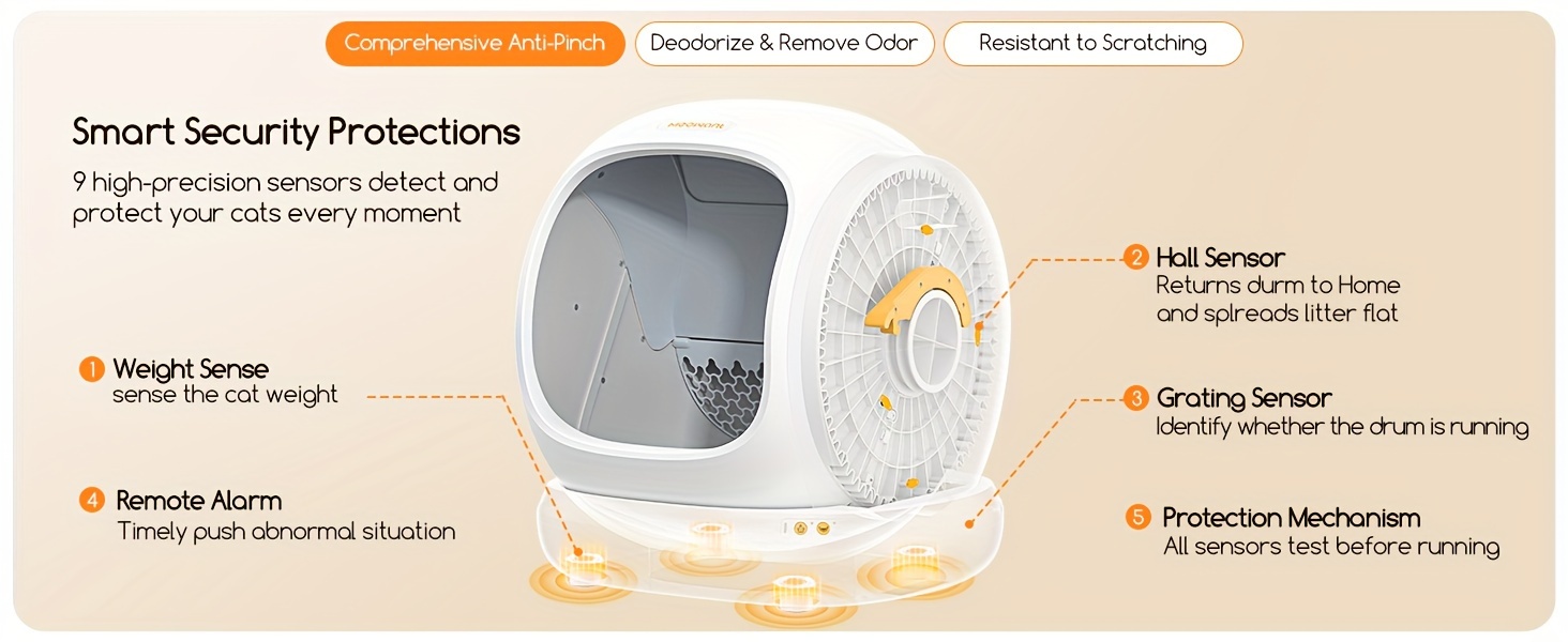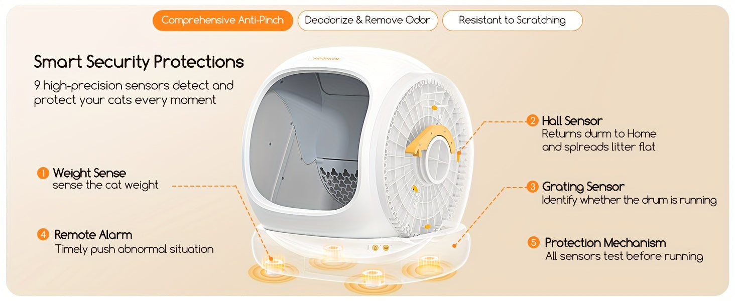 Anti-Pinch & Abnormality Alerts: Unique Integrated Anti-pinch Structure Of The Automatic Cat Litter Box Eliminates The Risk Of Cats Getting Caught Between The Litter Chamber And The Drum. Equipped With 9 High-precision Sensors For Weight Detection, Motion Stopping, And Abnormality Alerts To Ensure Cat Safety. Please Do Not Put The Mat Under The Litter Box To Avoid Weighing Errors