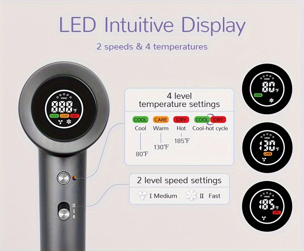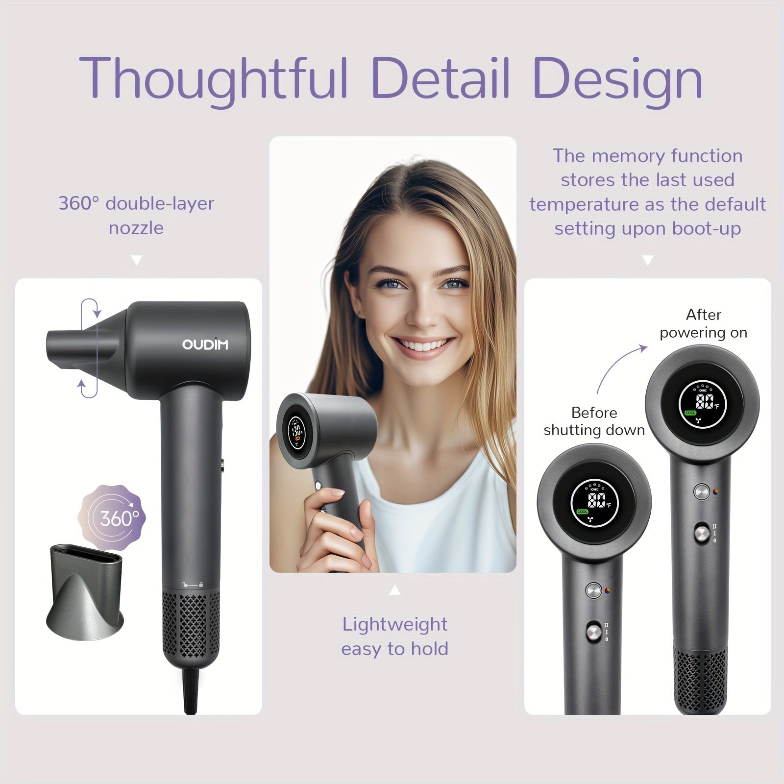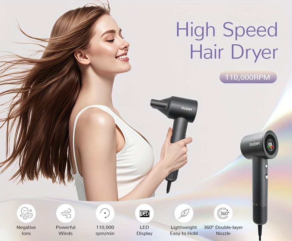 Oudif ™️Professional High-Speed Ionic Hair Dryer, 110000 RPM Brushless Motor, 4 Temperature Settings with LED Display, 2 Speed/Cold Options, Quiet Operation, Ergonomic Handle, US Plug –