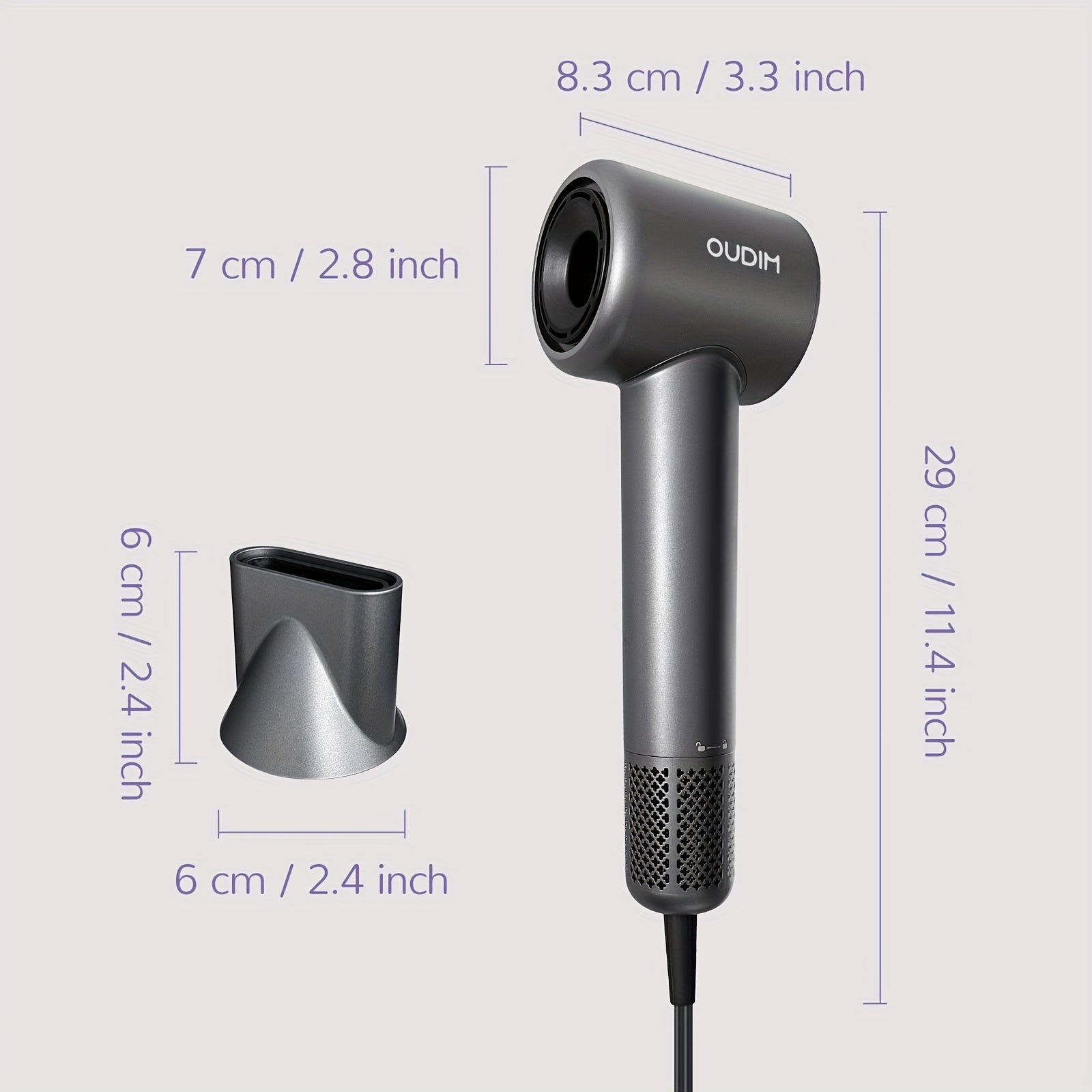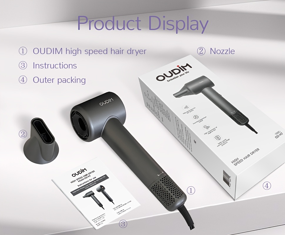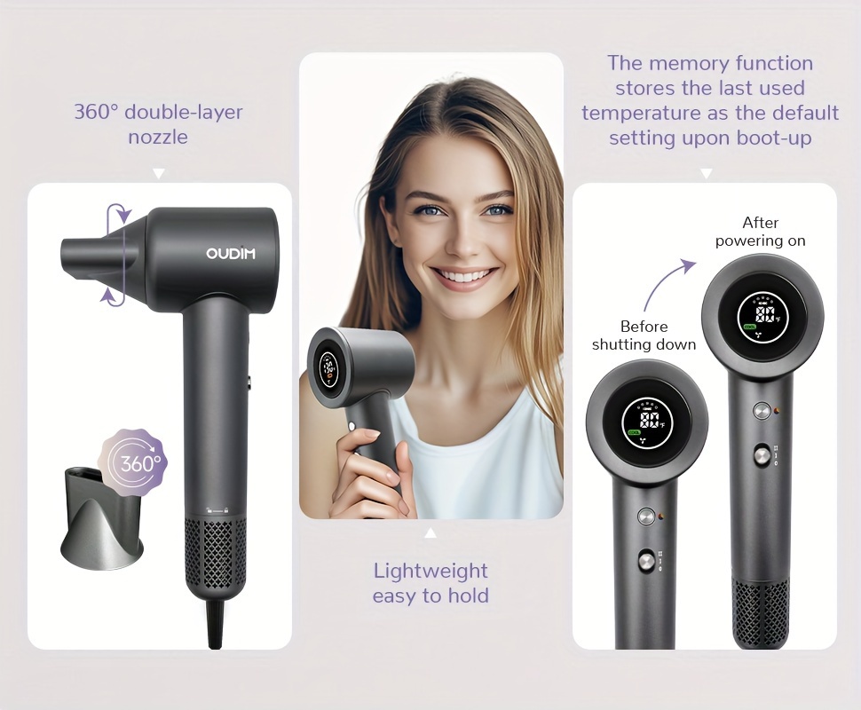The Oudif ™️ hair dryer is a high-performance tool designed for quick and efficient hair drying. With a powerful 110000 RPM brushless motor, 4 temperature settings and 2 speed/cold options, this dryer offers customizable options for every hair type. The ergonomic handle and quiet operation make it comfortable to use.