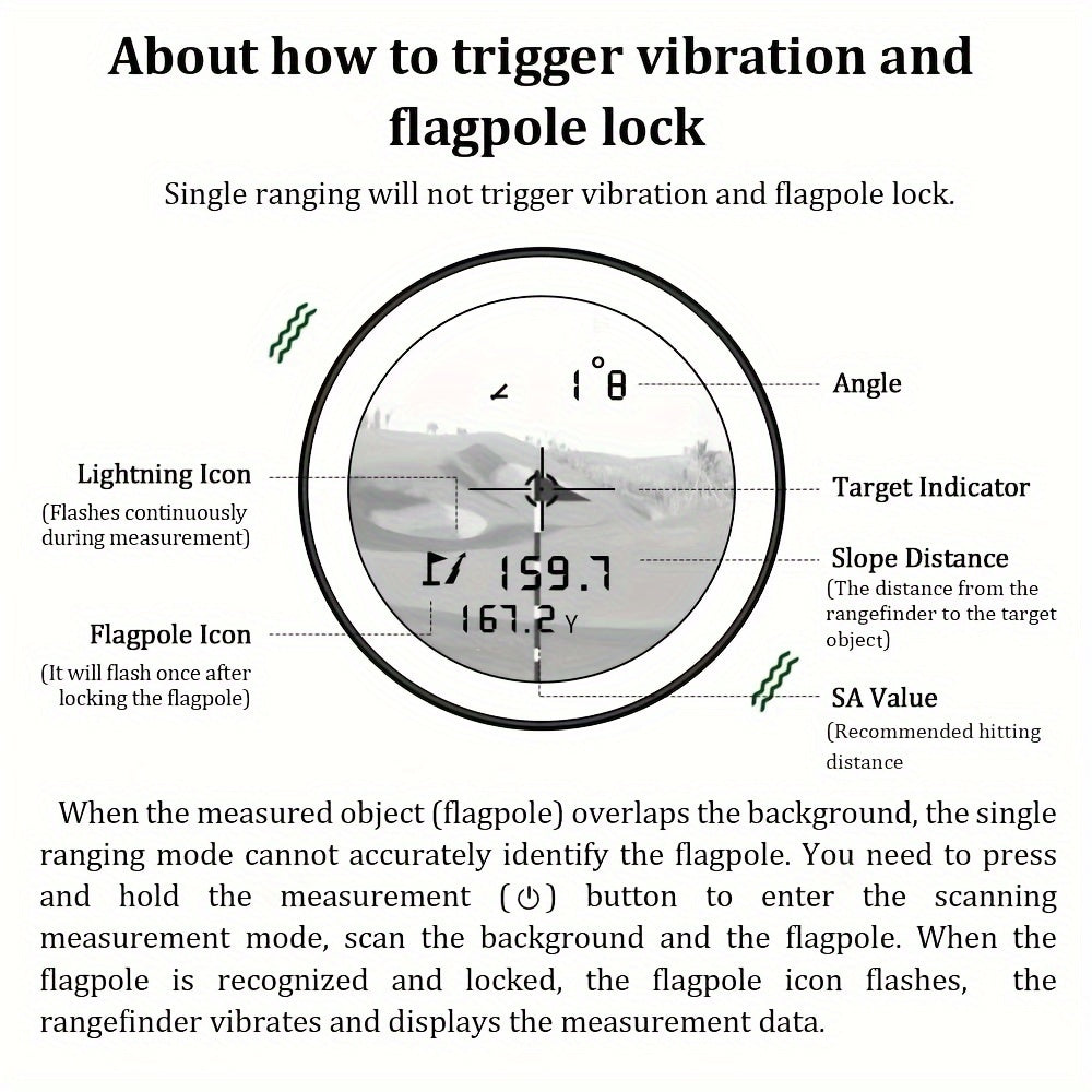 Long press the "Power" button to enter scanning mode. Aim at the background first and move towards the flag, it will trigger a vibration when the flag is locked. The golf rangefinder can lock a flag up to 250 Yards away.