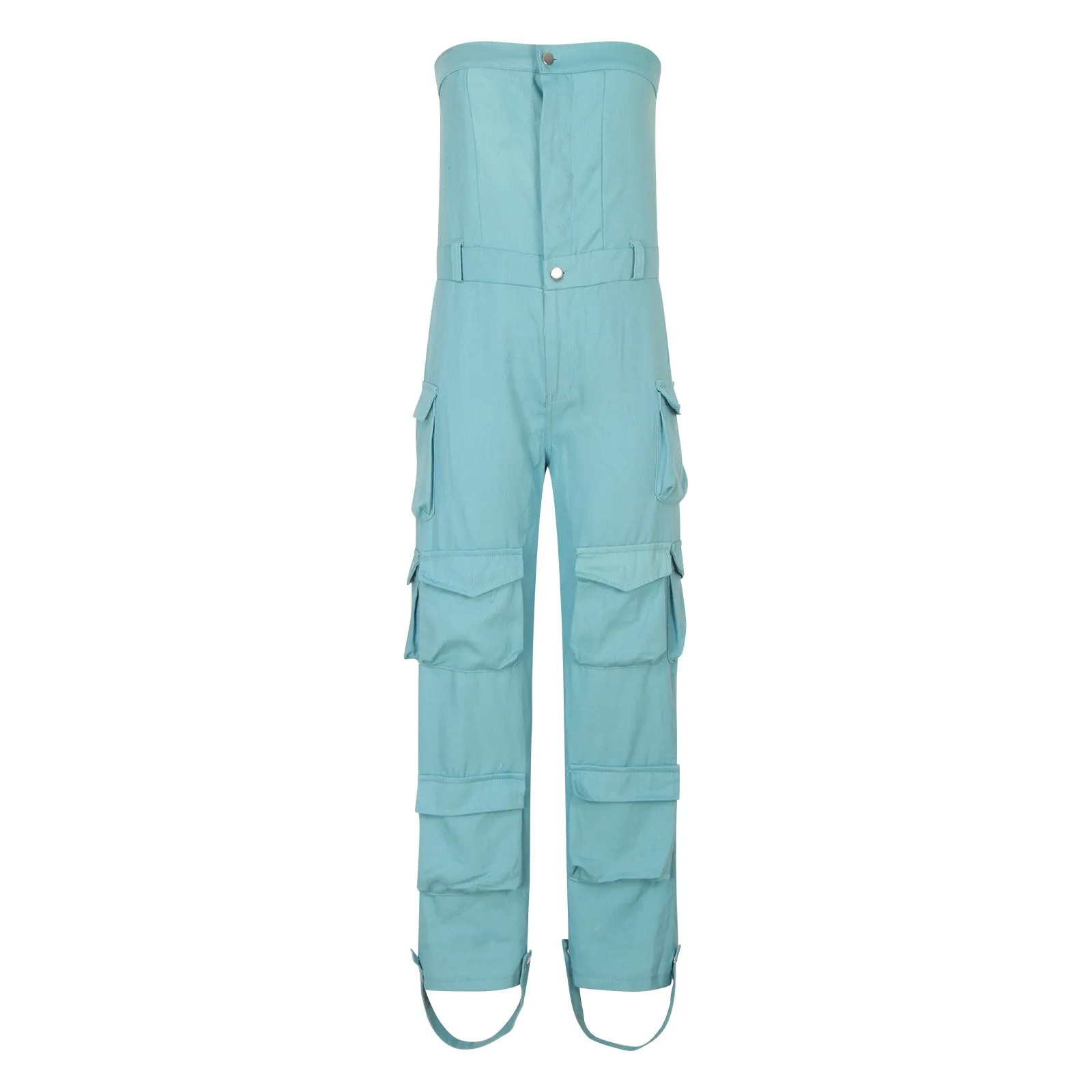 Design: denim fabric, tube, strapless, off shoulder, wide leg jean pants, high waist, with muti-pockets. Stand out in style with our wide leg denim cargo jumpsuit. The tube top and off-shoulder style create a chic and trendy look, while the loose and baggy fit en-sures all-day comfort. El-evate your street style game and turn heads wherever you go.
