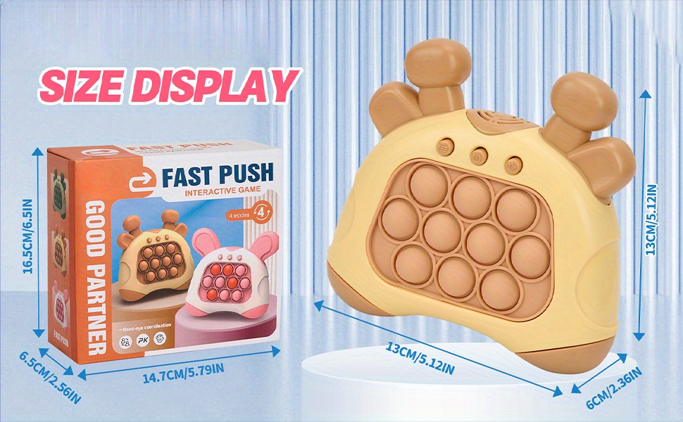 Product Name Pop Game Sensory Fidget Toy Material ABS Available Colors Pink, Green, Brown Patterns Deer, Rabbit Battery Requirements 3 X AAA (not Included) Modes Memory, Scoring, Advanced, Multiplayer Package Contents Game Controller Pop Bubble Toy, User Manual FAST AND FUN ELECTRONIC GAMES