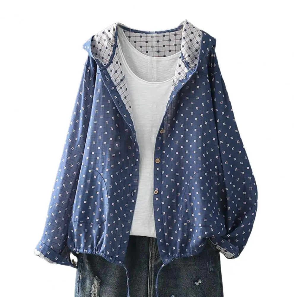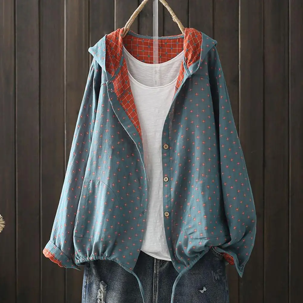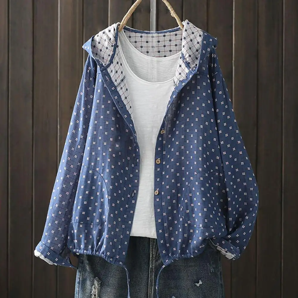 Introducing the women's printed jacket, crafted from premium cotton for a soft and comfortable feel. This mid-length jacket features a hood and convenient side pockets, perfect for storing daily essentials while keeping your hands warm. The simple yet elegant design exudes style, making it a versatile piece for various occasions.